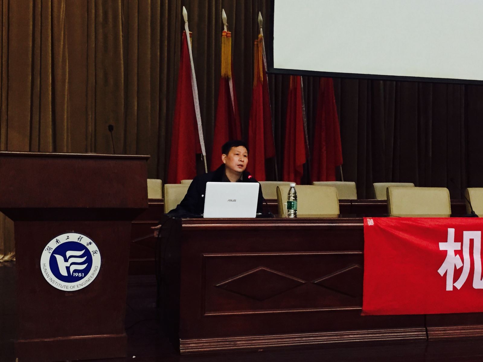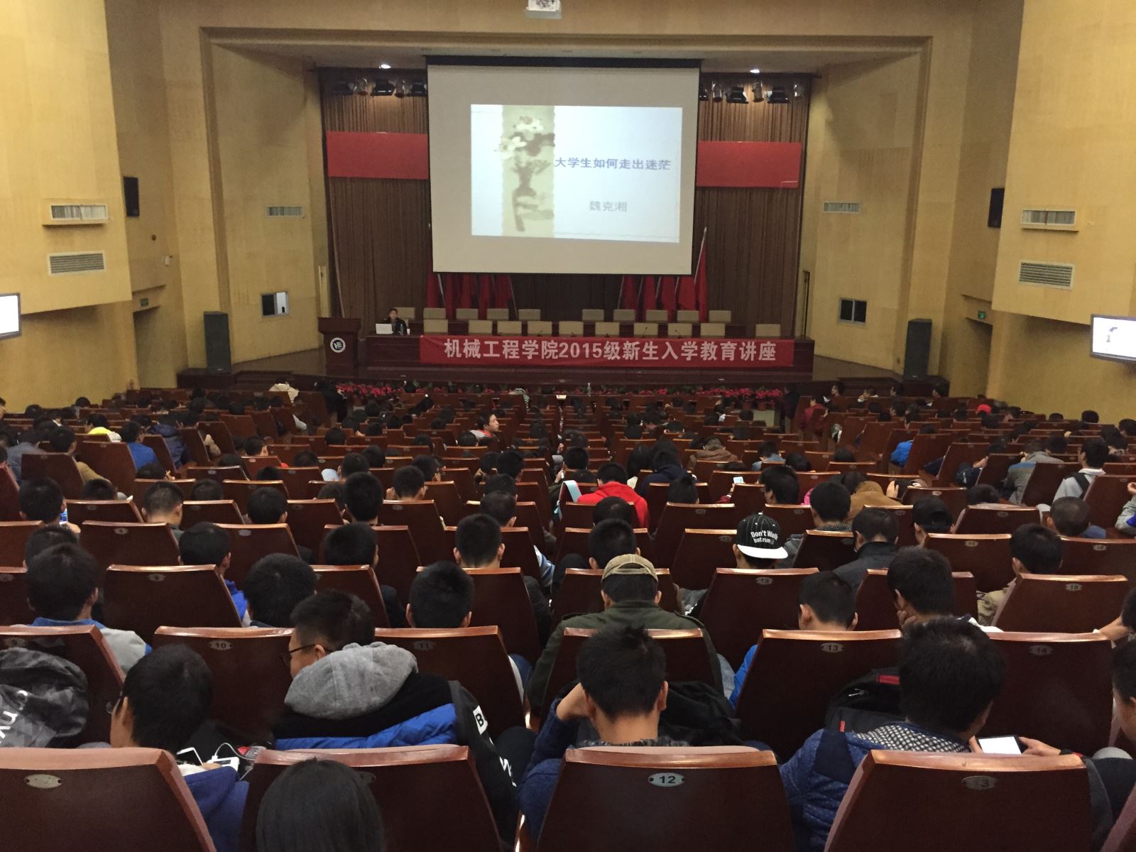 11月19日晚,机械学院院长魏克湘在主校区一报告厅为2015级全体机械新生主讲了“大学生如何走出迷茫”教育讲座。院党总书记谢骐、学办部分老师及全体新生参加讲座。