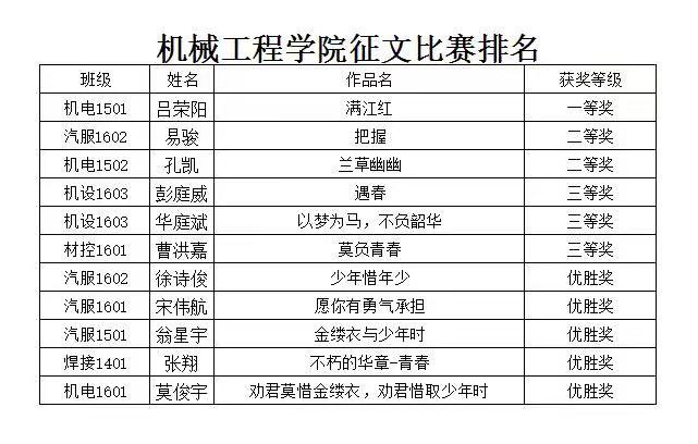 比赛自开始以来,学院全体学生积极参与,踊跃投稿,评委组共收到学生投稿47篇。经过评审团的公平公正评选,最终评出一等奖一名,二等奖两名,三等奖三名及若干优胜奖。其中,来自机电1501班的吕荣阳同学的诗词《满江红》凭借情景交融、灵活用典的写作手法与贴近现实生活的情感描写摘得桂冠。来自汽服1602班的易骏和机电1502的孔凯的作品《把握》与《兰草幽幽》获得并列第二名。