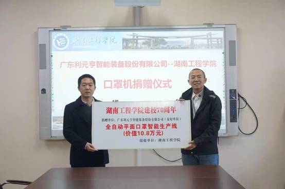 吴玉祥为学校给利元亨搭建的人才招聘平台表示感激,对学校务实、创新、开拓的校风给予充分肯定。目前已有多名校友成为公司的技术骨干,期待后续有更多的湖工学子加入。他表示,利元亨是一支团结有战斗力的有强烈社会责任感的年轻团队,在2020年新冠疫情最严重时期,项目团队加班加点,仅用一周时间就成功开发了全自动智能口罩生产线,三个月时间完成了几百台设备的交付,为抗击疫情肩负了应尽的社会责任。此次捐赠全自动平面口罩智能生产线,希望能助力实验室建设,进一步提高学生的动手能力,同时将这种有责任有担当的企业文化精神传递给学生。智能口罩生产线目前已安放于学院实验室,待调试完成后将投入实验教学和专业实训。