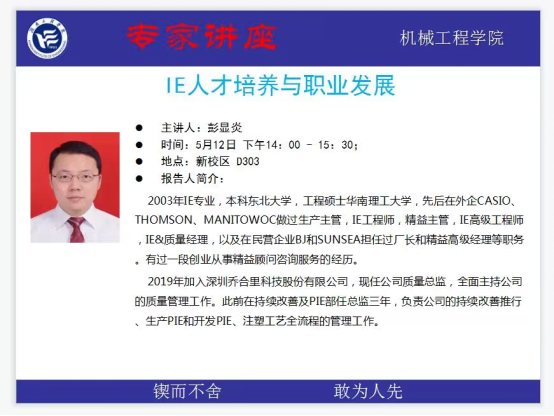 5月12日下午,威尼斯9499登录入口在教学楼d303举办“IE人才培养与职业发展”讲座。深圳乔合里科技股份有限公司质量总监、企业导师彭显炎担任主讲嘉宾,威尼斯9499登录入口工业工程教研主任谢富春主持讲座,工业工程专业学生听取讲座。