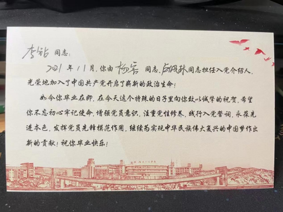 学院党委为全体毕业生党员发放了离校前“最后一张政治生日贺卡”,并带领他们重温离校前“最后一次入党誓词”,铮铮誓言久久回荡在机械楼。毕业生党员唐渝城在通往为人民服务的车票上签名时说到,“这次毕业生党员教育大会是一次政治教育、思想洗礼、党性塑造。即将告别母校,步入社会,我会谨记学校领导、老师的教导,在社会这个大课堂里强化奉献担当,用自己的行动,为党旗增辉,向母校献礼。”