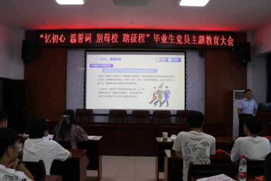 魏克湘以“忆初心 温誓词 别母校 踏征程”为主题给毕业生党员上了离校前“最后一堂党课”。他从跌宕起伏、奋勇争先的党史,到人文与科技交融的湘潭地方史,再到开拓创新、不断发展的校史三个方面向毕业生传达深深的爱国、爱潭、爱校之情。他从当前制造业发展局势出发,结合全国劳动模范黄祥全、湖南省优秀大学生党员曾浩和湖南省最美大学生刘毅等校友和学生的先进事迹勉励2023届毕业生党员勇担时代重任,为祖国建设事业贡献出青春力量。