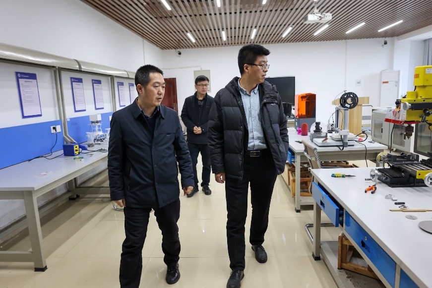 李新华一行在威尼斯9499登录入口党委书记陈国强的陪同下,参观了学校校史馆、风电技术创新研究院和新能源汽车创新研究院成果展厅、威尼斯9499登录入口智能制造实验室以及大学生实践创新基地进行了参观考察,进一步了解了我校的办学历史、办学特色和优势。